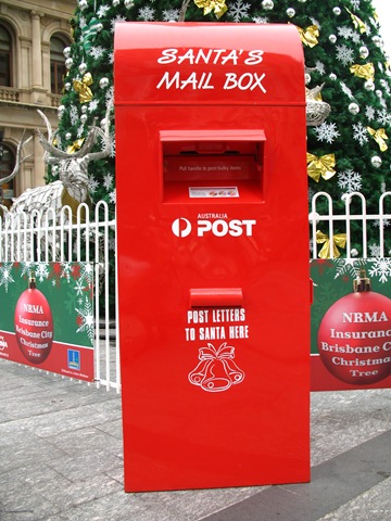Toto sa mi najviac paci, australska posta nainstalovala vedla stromceka specialnu schranku na listy pre Santu. Ked sme boli v Myer Centre (obchodne centrum), tam su zasa detske pocitace nainstalovane s napisom Email Santa, teda deti tam posielaju emaily Santovi s vianocnymi zelaniami :) - tam to pojali ako v 21.storoci :). V Cannon Hille sme videli zasa tradicne kreslo so Santom, kde si mu deti sadaju na koleno a suskaju vianocne zelanie, potom ich tam fotia, atd. presne ako v americkych filmoch :)