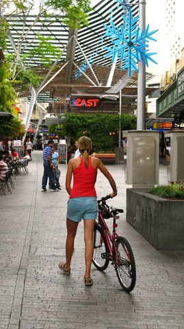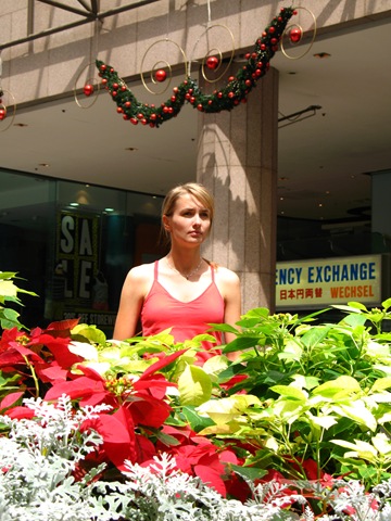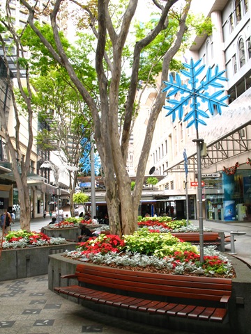 A toto uz je Qeen Street, pesia zona a zaroven najvacsie obchodne centrum v Brisbane. Je to vlastne jedna dlha ulica, na zaciatku ktorej vojdete do obchodu a mozte vyjst na druhom konci ulice :). Tie cervene a bledozlte kvety su vianocne ruze.