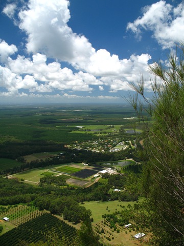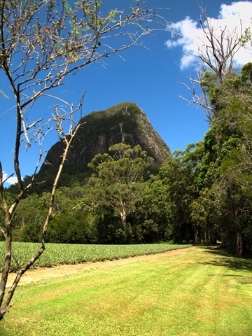 V pozadi nalavo je najvyssi vrch Glass House Mountains a zaroven celeho Queenslandu, Mt. Beerwah 556m.n.m. a ten spicak napravo je Mt. Coonowrin 377m.n.m. a najstrmsi v Glass House Mountains a nedostupny pre verejnost.