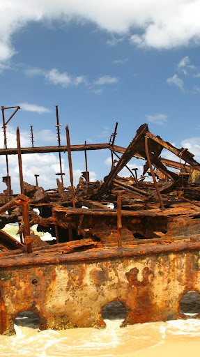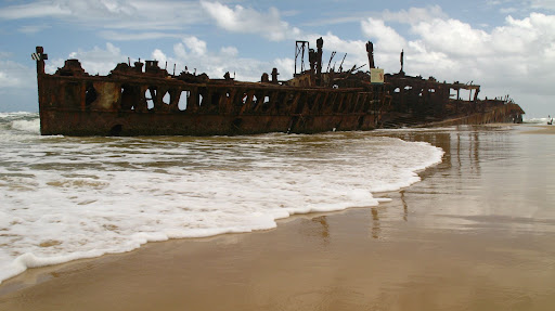 Ta lod bola vraj luxusna oceanska lod prepravujuca ludi medzi Novym Zealandom a ...? Neskor ju predali do Japonska, kam ju chceli odtiahnut s druhou lodou. Aby sa im lepsie tahalo dali dolu lodny srob (vrtulu), co sa ukazalo byt ako osudne, pretoze prisla velka burka, ktora roztrhla lana a bezmocna lod bola vyplavena na pobrezie. Aby toho este nebolo dost, pocas druhej svetovej vojny na nej trenovali bombardovanie australske a novozealandske jednotky:(, preto je taka aka je:)