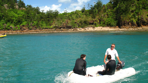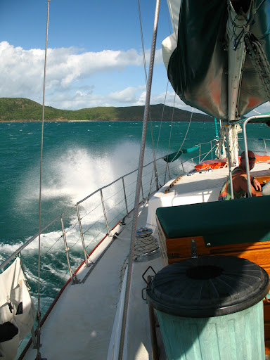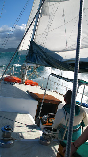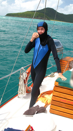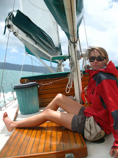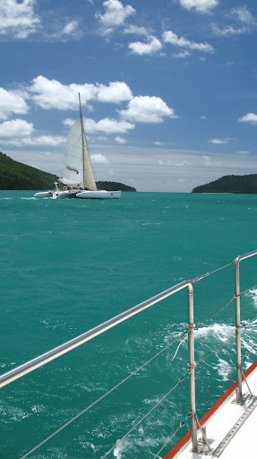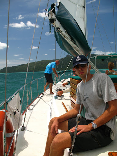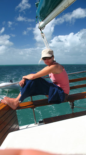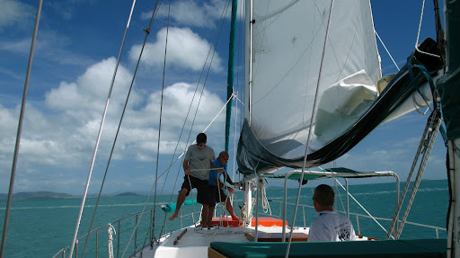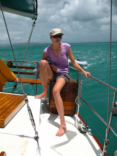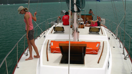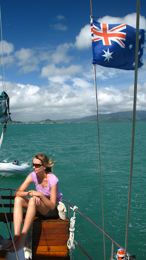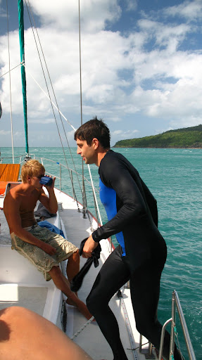 Vyrazalo sa v stredu rano o 9am z pristavu v Airlie Beach. Na palubu sme si mohli vziat iba zopar veci (ziadne sklo), takze sme sa zbalili do dvoch malych prirucnych tasiek a slo sa... posadka bola super, kapitan Wayne a "dievca pre vsetko" Paul. Spolu s nami sa plavili dalsi 6ti Briti (Pommies, ako ich volaju Ozyci:), 1 Nemka a 1 Svajciarka, takze celkom komorna atmoska.