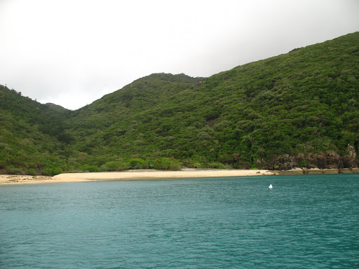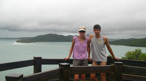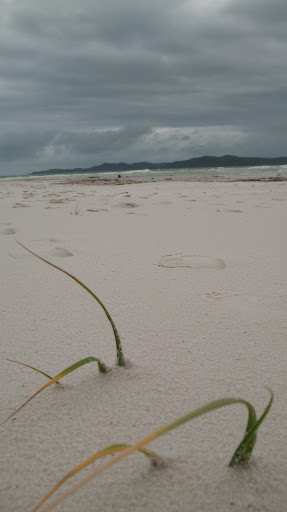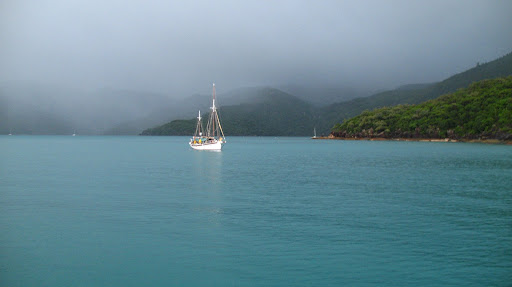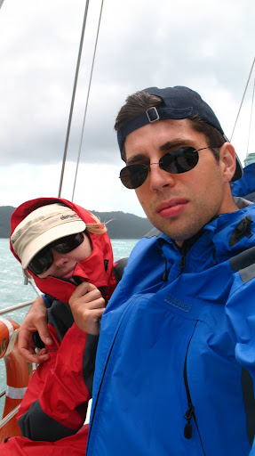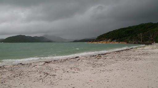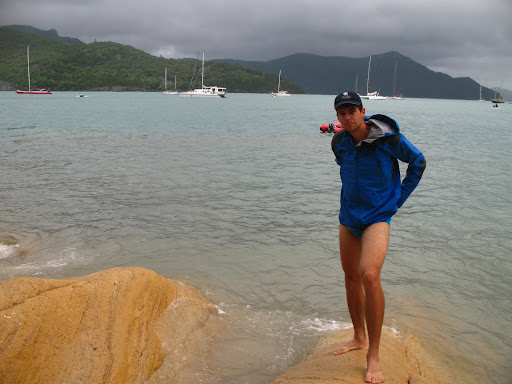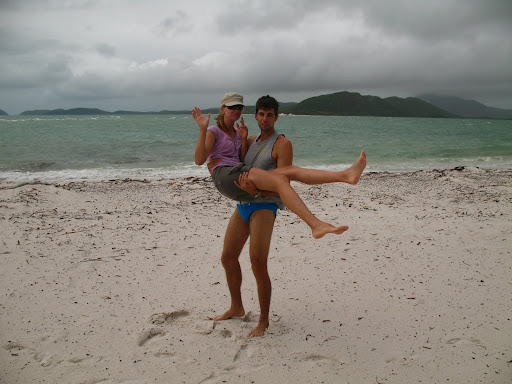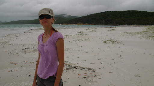 Druhy den sme ocenilo, ze sme si so sebou zobrali nase nepremokave bundy, pretoze od rana do vecera prsalo a fukal sialeny vietor:) Celu cestu sme sedeli nalepeni na seba na zadnej casti paluby s nohami zakrytymi mokrymi uterakmi, ale bavili sme sa... zo zimy nas vytrhol vyborny obed, caj a kafe:) Stanus bola po tych tabletkach (ktore boli iba na prirodnej baze vyrobene iba zo zazvoru, resp. krasne slovensky z dumbiera, ktory ma ukludnujuce ucinky na zaludok, dokonca aj pri rannych nevolnostiach:) stale ospala, tak som jej vzdy vymasiroval premocene chodidla a v hupajucej sa kajute vzdy zaspala behom 5min. Ja som sa snorchloval medzitym v dazdi, co bolo tiez celkom zabavne, ale voda bola fajn, myslim ze okolo 28C, mozno viac... V tom dazdi nas zobrali aj na "udajne" najkrasie:) miesto na Whitsunday Islands, na Whiteheaven Beach, ktora je na Whitsunday Islande. Ked sme tam dorazili, bolo nadherne zamracene a neskor zacalo liat, takze romantika:)